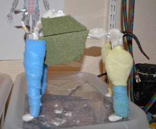 The plastic and aluminum wire armature is given some light weight bulk by using hard foam camping cushions (the moss green material) along the torso and in the legs.