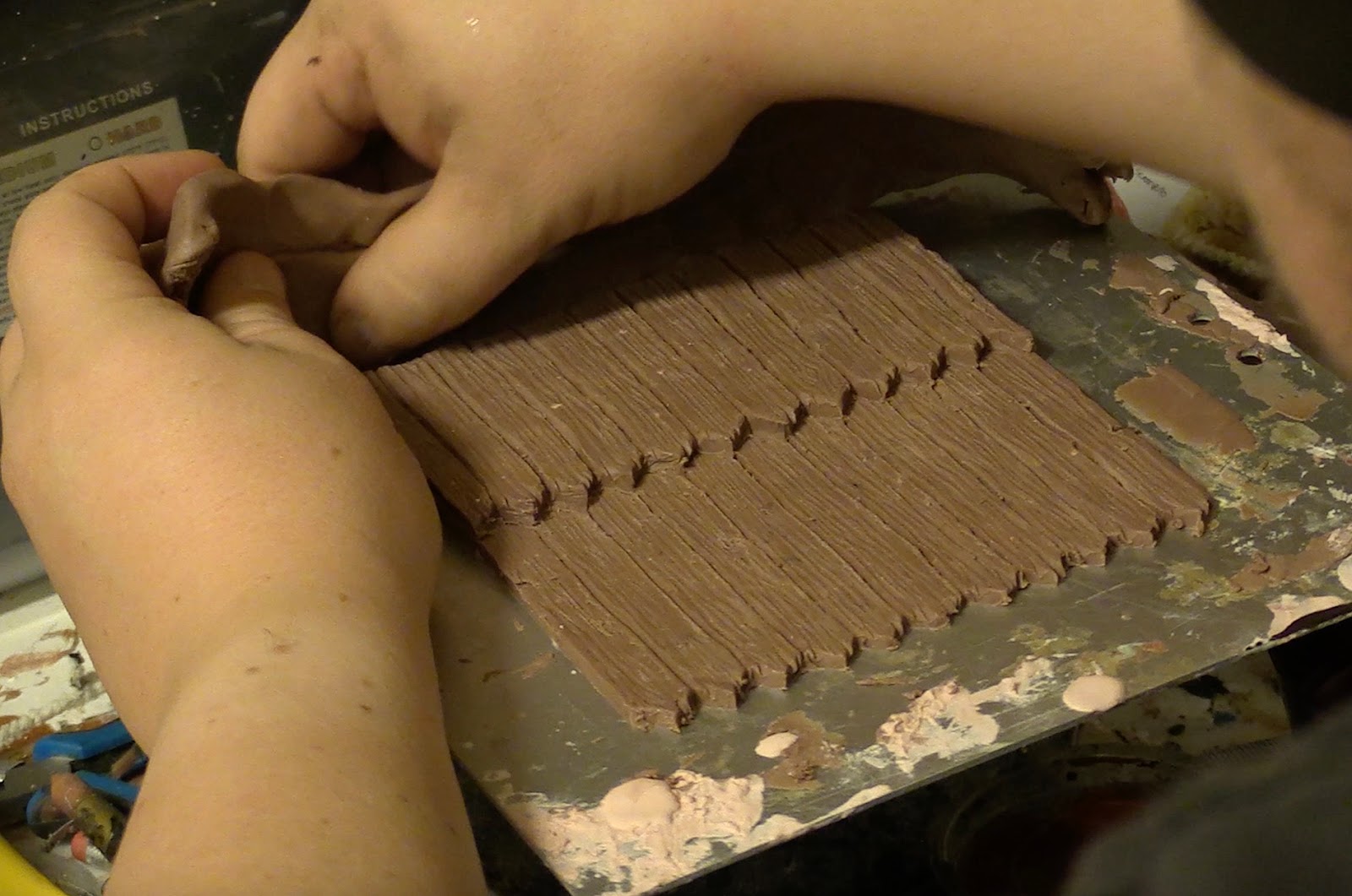 I used a sharp loop tool to cut into the clay. This way I could place the logs over each other the way a big log cabin is built (I'm assuming).