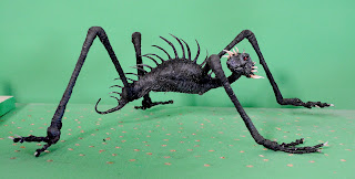 Patches of latex skin cast in a skin texture mold covered the whole puppet, and a blend of cotton and latex was used to detail the puppet. Red reflective beads became eyes. Although the puppet's body is quite small it still has quite a big spread, a little over a foot, because of its long legs.
