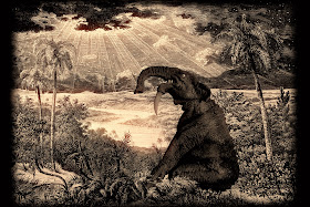 I simply downloaded real etchings from stock image site Depositphotos, did a bit of tinkering with them in Photoshop and added the images in After Effects along with my animated Deinotherium puppet. Also in AE I added a filter simulating old, flickering film stock, as well as the sepia coloring.